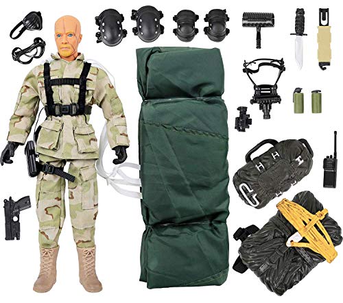 Set includes; 1 paratrooper figure with clothes and dog tag, parachute backpack, helmet, rifle, bayonet W/case, knee and elbow pads, revolver, goggles, oxygen mask, ammo.