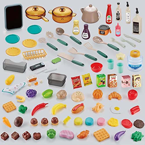 [Real Kitchen Experience] Electronic stove has realistic electronic lights and sounds. Adding water to the side of the stove will simulate steam,and the color of the food (steak, shrimp) will change at 28°C.Kids Cooking Sets real adds to the fun of role-playing.